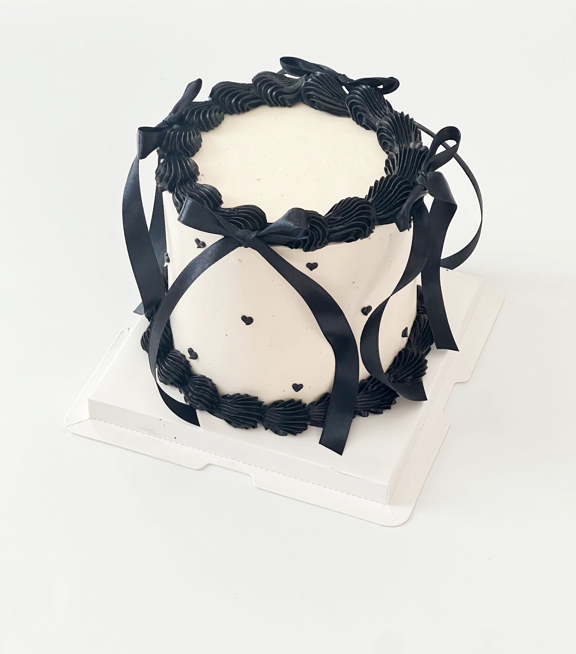 Meet Paris — our dreamy, vintage-inspired cake designed for lovers of soft elegance and feminine charm. Decorated in delicate piping, adorned with sleek satin bows, and finished with your choice of sweet heart accents or chic polka dots, this design captures the effortless romance of a Parisian patisserie.